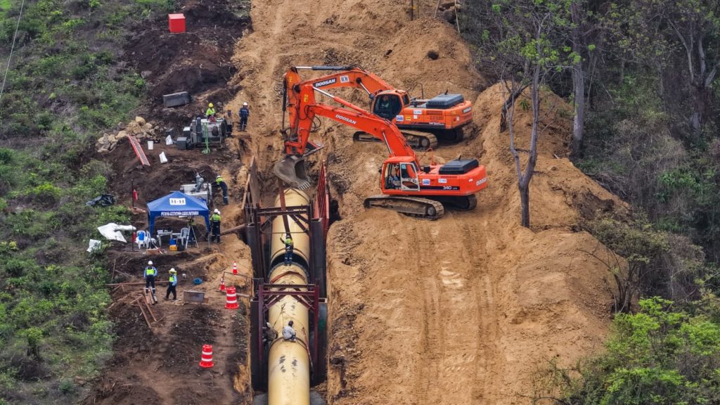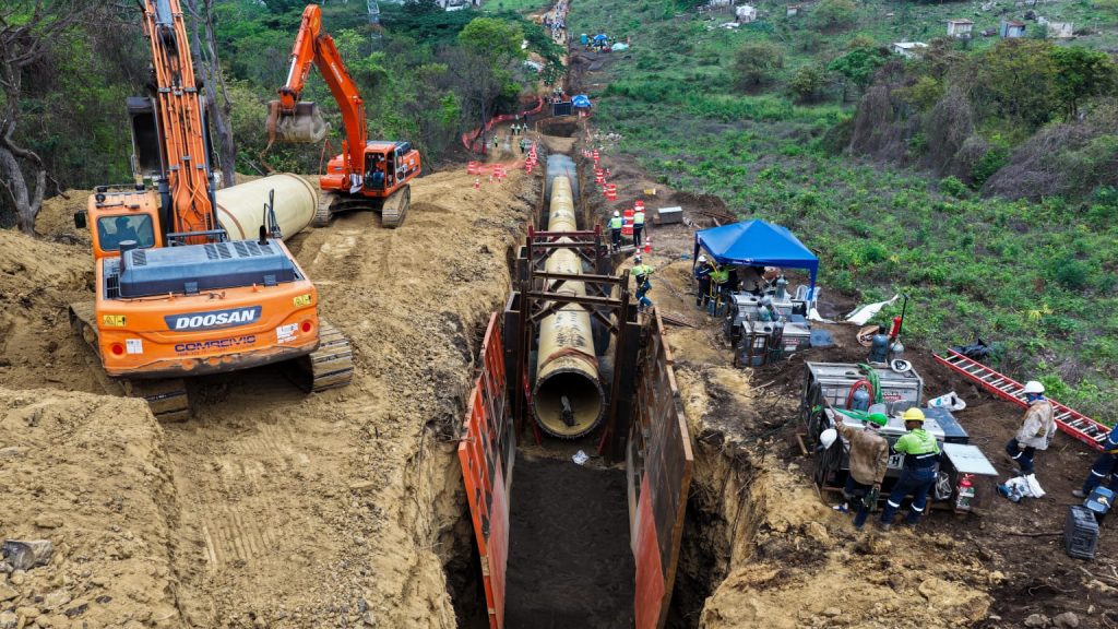 La construcción del sistema de agua potable del Tramo 1 del Quinto Acueducto, que va desde la Planta Potabilizadora “La Toma”, ubicada en el kilómetro 24 de la vía a Daule, hasta el punto de conexión en el tramo existente que abastece al reservorio “Ciudad Victoria”, se encuentra en ejecución desde el 11 de julio de 2025.