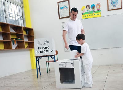 Olón, Santa Elena. – El presidente de la República, Daniel Noboa Azin, esta mañana ejerció su derecho al voto —por la consulta popular y referéndum 2025— en la escuela Antonio Moya Sánchez, ubicada en Olón.