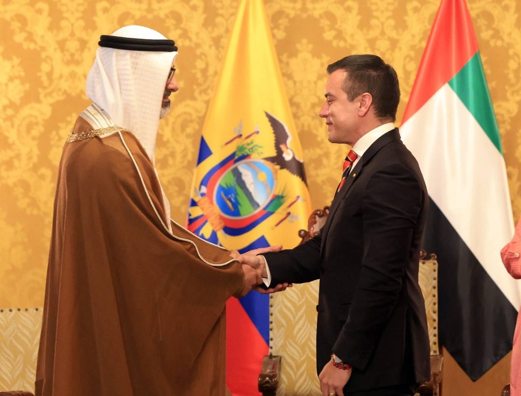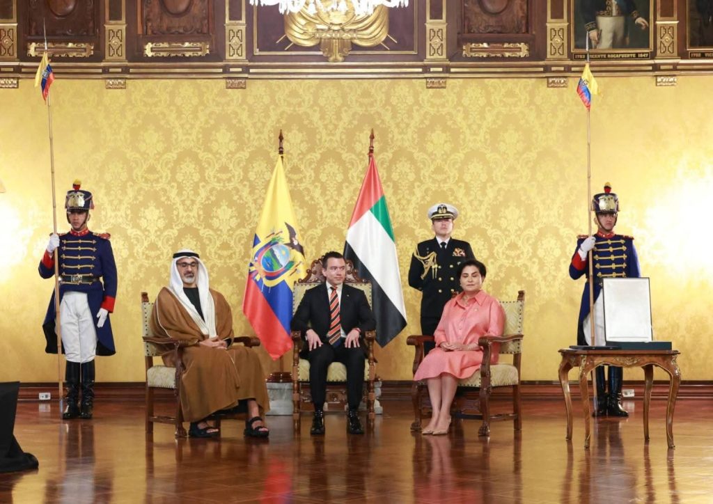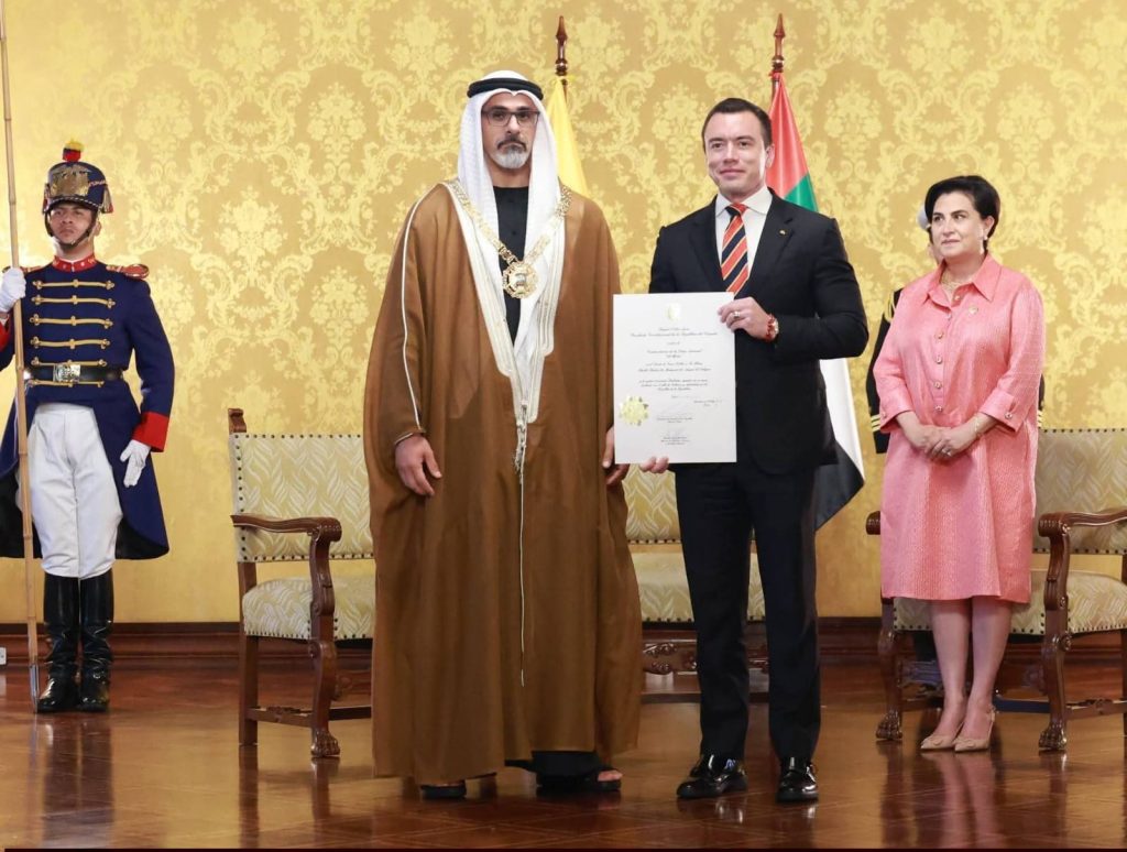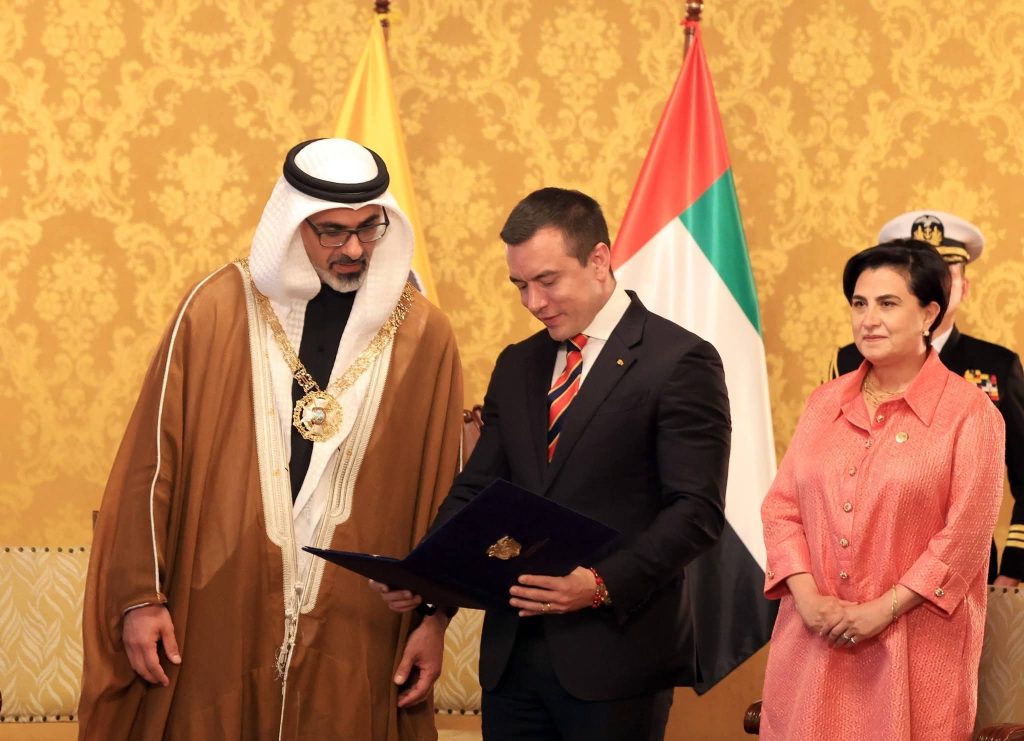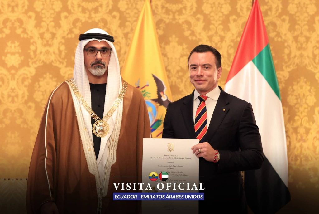 En el marco de esta visita, el presidente Daniel Noboa otorgó la condecoración de la Orden Nacional al Mérito en el Grado de Gran Collar a Su Alteza Sheikh Khaled bin Mohamed bin Zayed Al Nahyan, Príncipe Heredero de Abu Dabi. Este reconocimiento es la máxima distinción que otorga el Estado ecuatoriano a un visitante oficial de alto nivel.