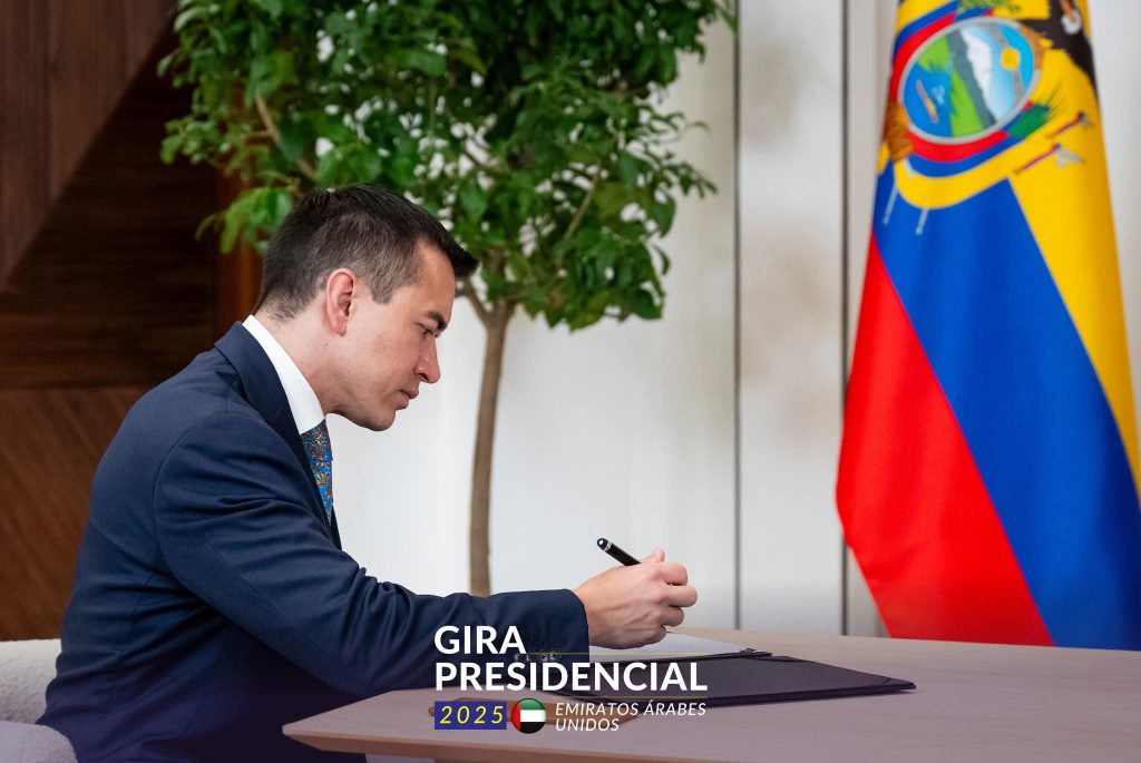 Abu Dabi, Emiratos Árabes Unidos. – La agenda internacional del presidente de la República, Daniel Noboa Azin, en Emiratos Árabes Unidos (EAU), consolida acuerdos históricos en beneficio del Ecuador. Este sábado 6 de diciembre, el Jefe de Estado ecuatoriano y el presidente de EAU, Su Alteza el Jeque Mohamed bin Zayed Al Nahyan, mantuvieron una reunión de alto nivel. En el marco de este encuentro, el presidente Noboa suscribió el Tratado Internacional de Promoción y Protección de Inversiones.