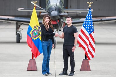 Manta, Manabí. – El presidente Daniel Noboa se reunió este 5 de noviembre de 2025 con la secretaria de Seguridad Nacional de Estados Unidos, Kristi Noem, en la sede del Escuadrón de Combate N.° 2313, ubicado en la estación aeronaval de Manta, junto al Aeropuerto Eloy Alfaro. La visita de la funcionaria estadounidense facilitó el intercambio de información para explorar la iniciativa del Jefe de Estado ecuatoriano respecto de una potencial instalación de bases de Homeland Security en Manta o Salinas, como parte de la estrategia del Gobierno en su lucha contra el crimen organizado transnacional.