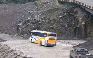 Un bus de la cooperativa Baños quedó atrapado con pasajeros en el río Marker, en el socavón de San Luis,...