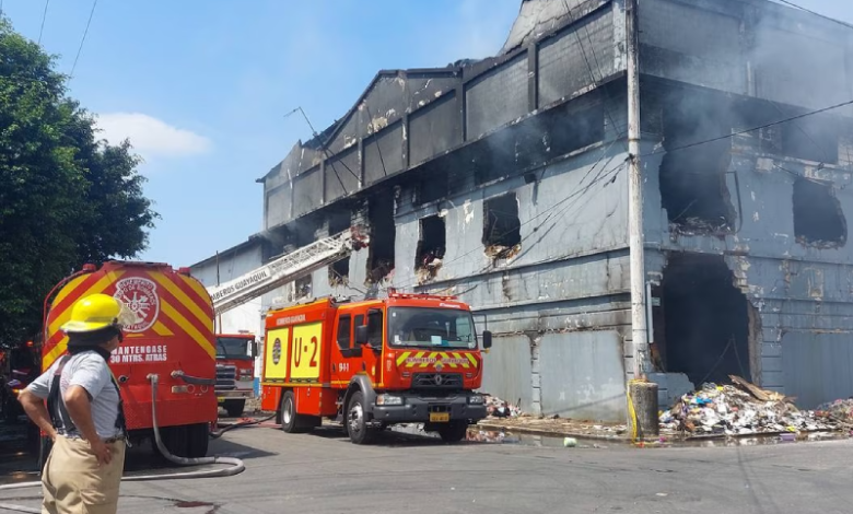Dijo en el lugar que personal de la casaca roja acudió para remover escombros y echar agua en partes de la gran bodega que ardió durante horas.